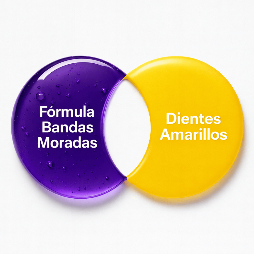 La tecnología morada neutraliza ópticamente los tonos amarillos al contacto, haciendo que los dientes se vean más blancos de inmediato.